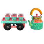 HandPainted Alluminium Tea Kettle with 6 Glasses and Wooden Tray For Home Decor , Tea Party , Serving